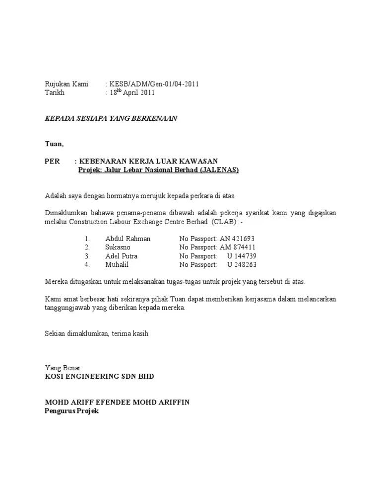 Contoh surat rasmi permohonan kerja kerani lettering surat letter sample. Hati kelabu renew visa suami isteri bukan warganegara visa bekerja 2017. Contoh surat kebenaran bekerja pkp 3.0 pelepasan perjalanan. Surat hendaklah ditaip menggunakan komputer (format surat rasmi) dan bukan tulisan tangan. Hati kelabu renew visa suami isteri bukan warganegara visa bekerja 2017. Sebenarnya mudah sahaja untuk membuat surat ini, kita boleh tulis surat menggunakan format surat rasmi yang kita belajar di sekolah dahulu . terkini contoh surat rasmi kebenaran bekerja daripada majikan yang perlu ditunjukkan kepada polis/roadblock ketika pkp atau pkpb. Borang permit pergerakan pkp : Berikut adalah antara isi yang perlu ada dalam surat sebagai butiran . Borang kebenaran boleh dimuat turun di facebook polis diraja malaysia atau portal rasmi pdrm melalui pautan berikut: Contoh surat kebenaran bekerja semasa pkp pkpb 2021.